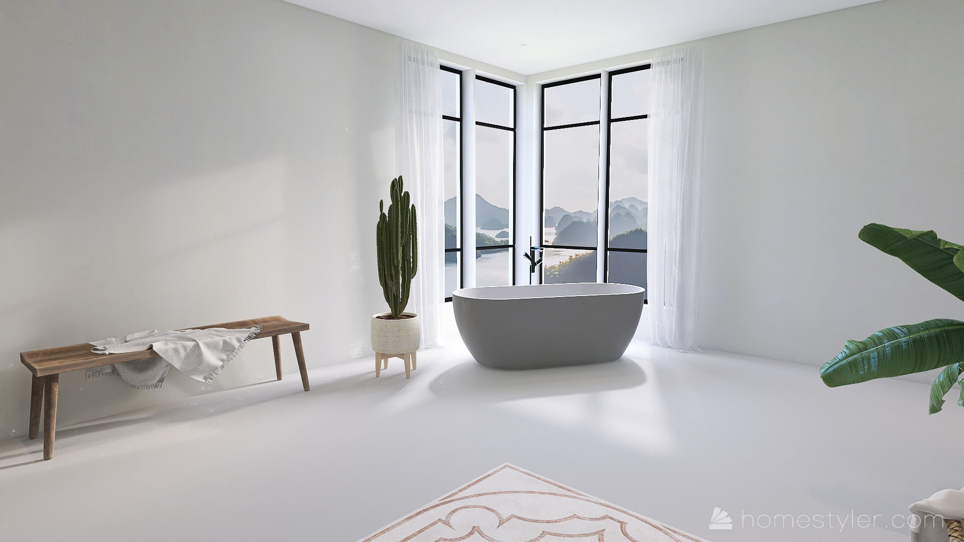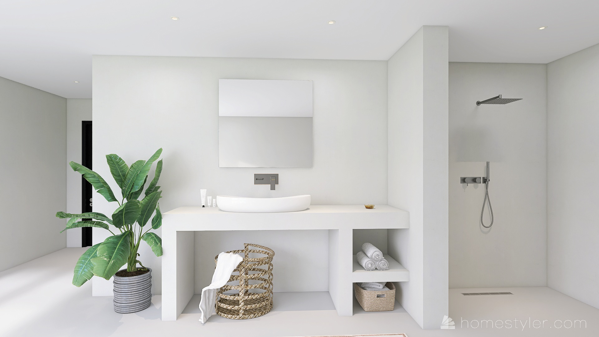 Deze badkamer heeft een rustieke en strakke stijl die je steeds vaker tegenkomt. Door planten en rotan materialen toe te voegen krijgt je meer warmte in je ruimte.