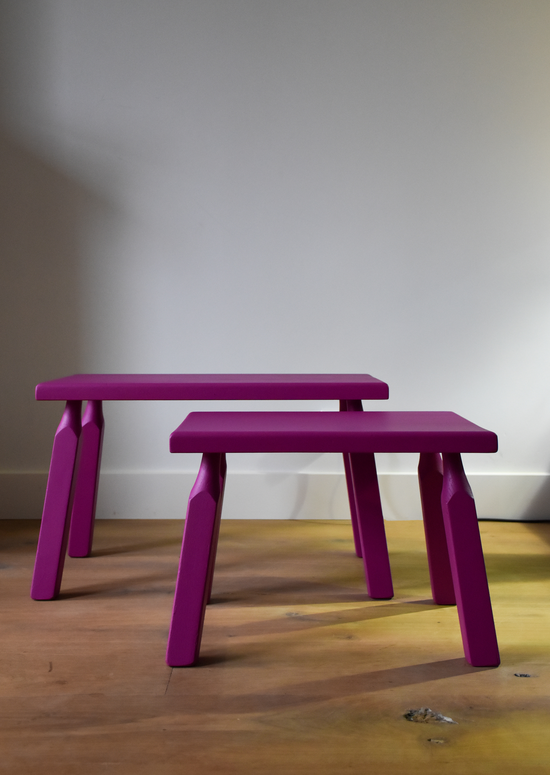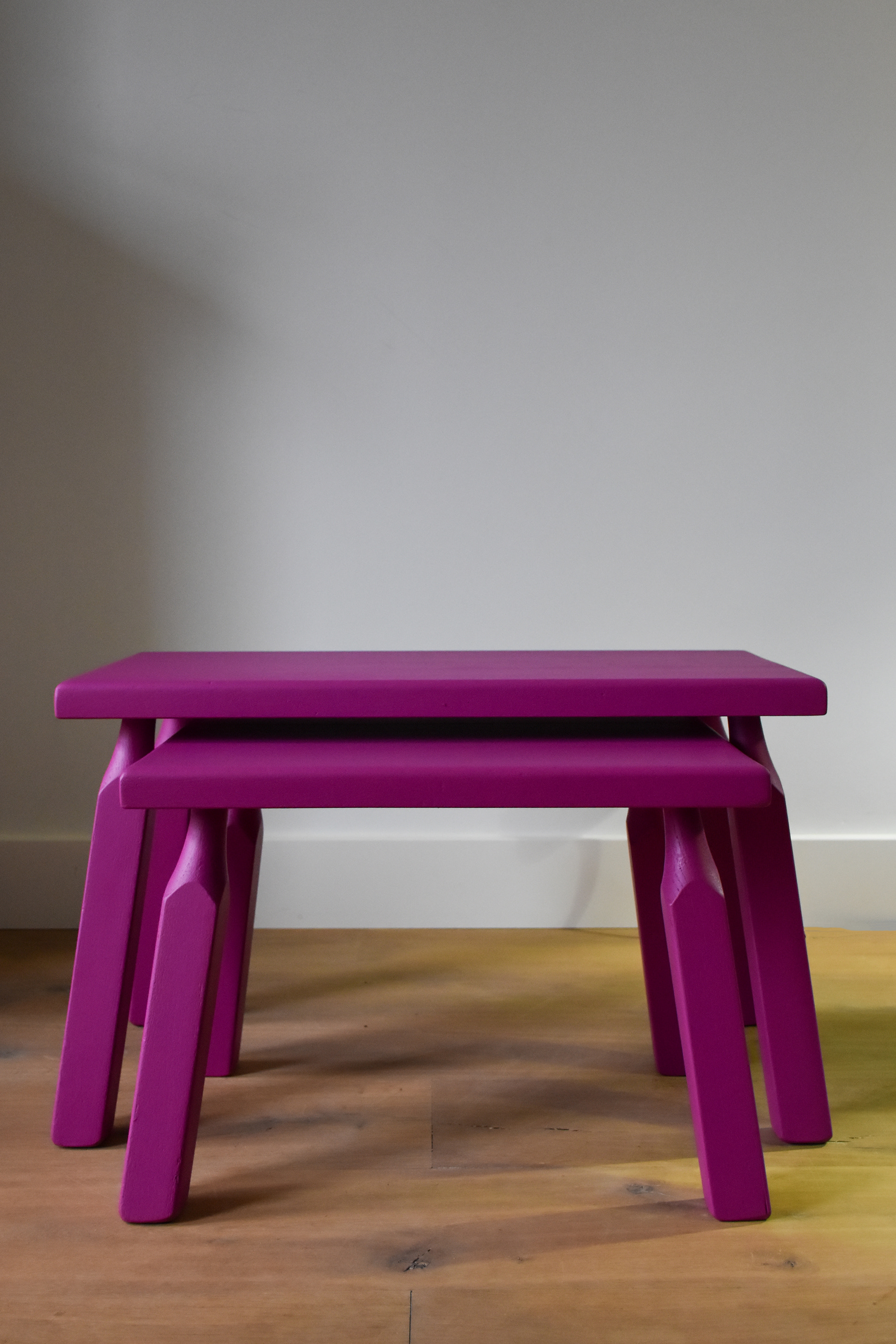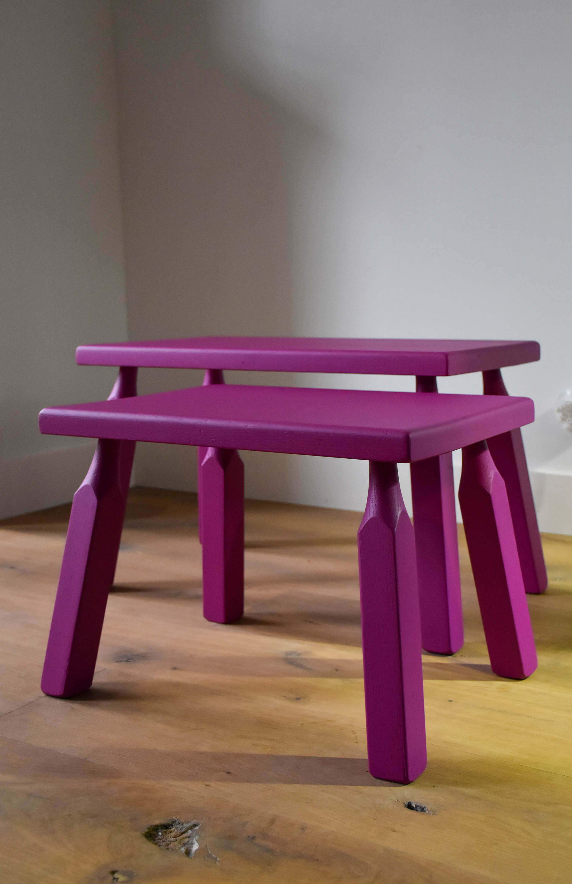 Deze eikenhouten, gerenoveerde bijzettafels zijn bewerkt met duurzame verf van het merk Fairf.