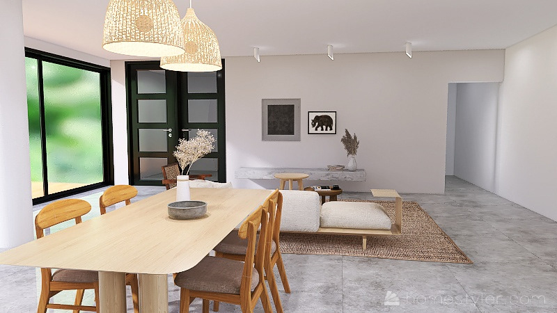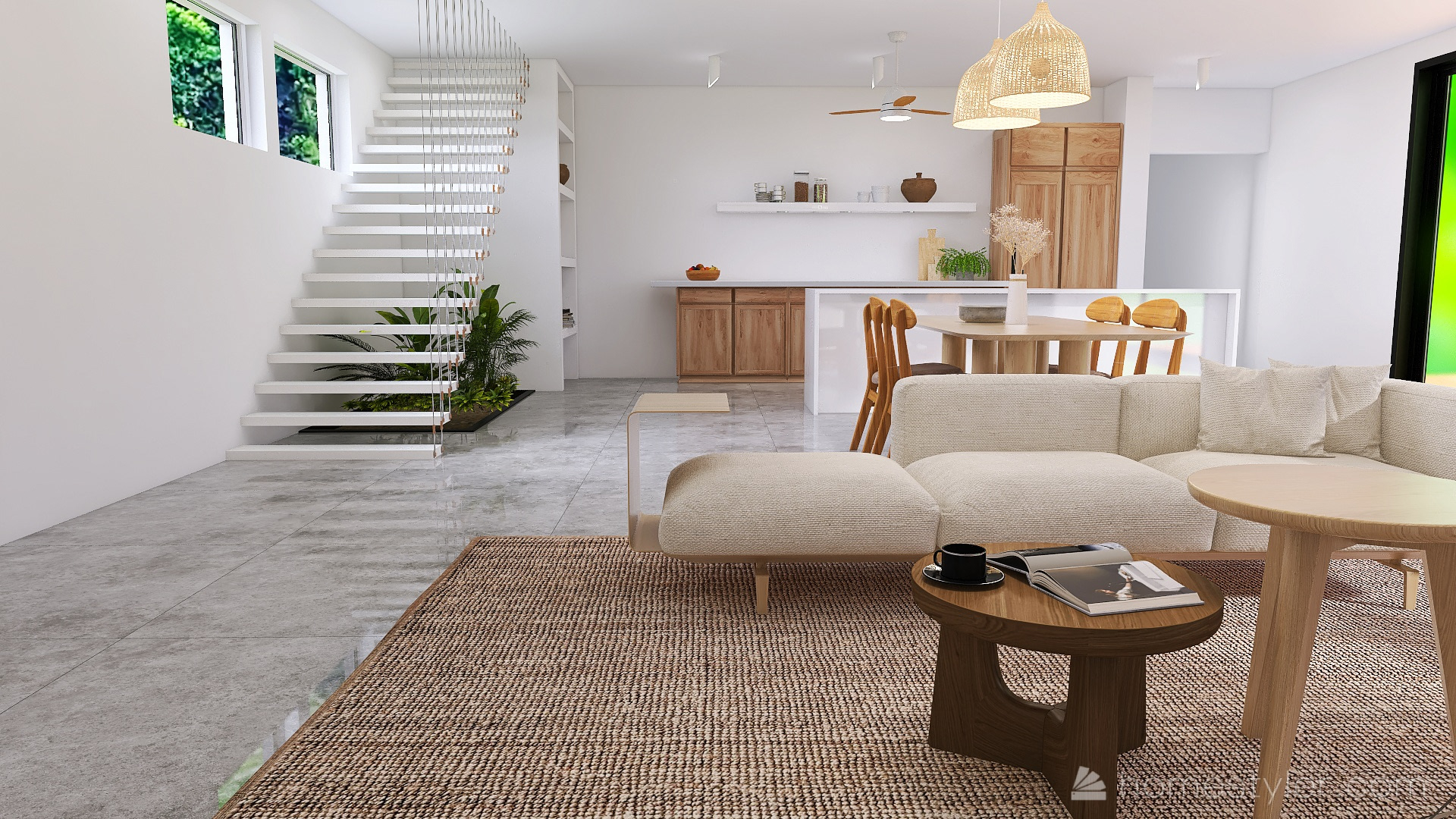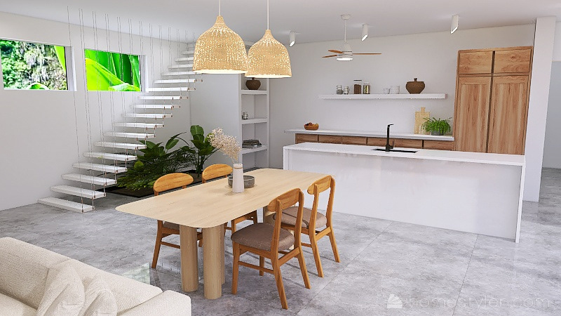 Dit interieur is geïnspireerd op een moderne, jungle stijl. De rustige kleurtonen vloeien in elkaar over en versterken de mooie open ruimte.